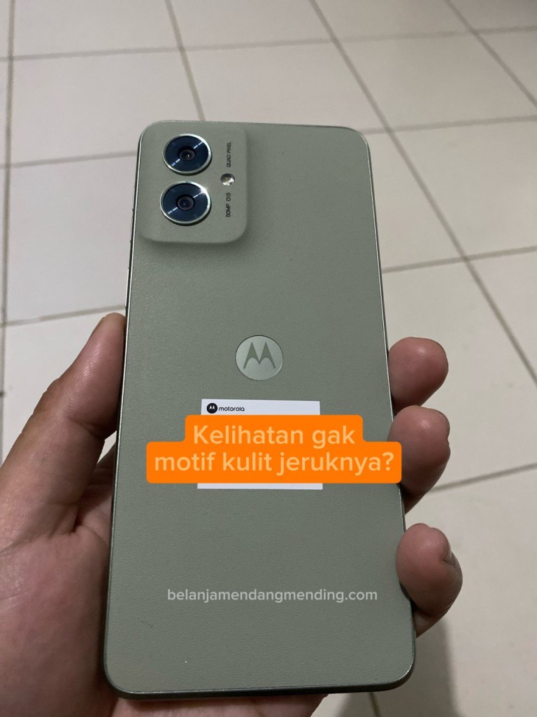 1. Desainnya sekilas gak beda dengan G45; backdoor plastik motif kulit jeruk tapi di Moto G55 dengan pilihan warnanya lebih mature. Gw ambil Smoky Green. Kamera utama 50 MP & kamera sekunder ultrawide 8 MP (kalo adiknya itu macro 2 MP).